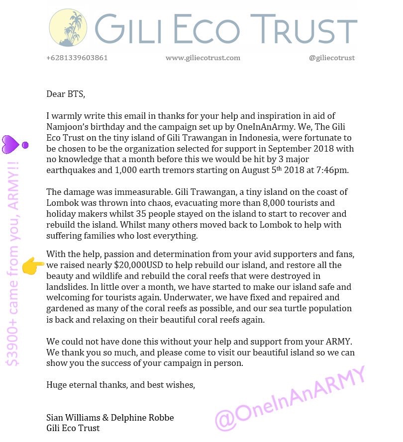 Gili Eco Trust sent an email to BigHit Entertainment and BTS thanking them for their positive influence that prompted ARMY to help Rebuild With Namjoon. They even invited the members to visit Gili and see what ARMYs did!