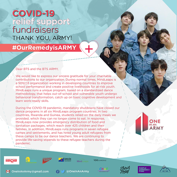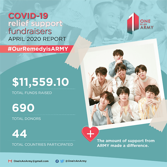 During the month of April, 690 ARMY from 44+ countries were able to raise $11,559.10 USD for COVID-19 relief efforts!