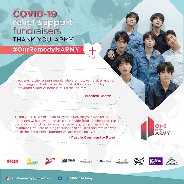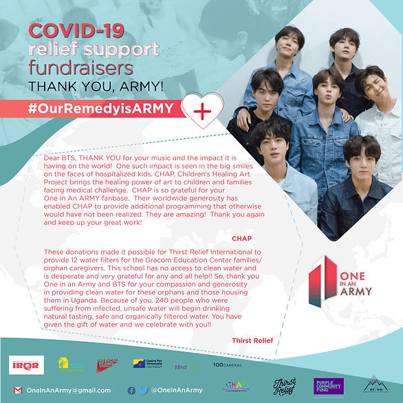 One In An ARMY are extremely proud to announce the results of our April campaign, Our Remedy Is ARMY, benefiting nine organizations!