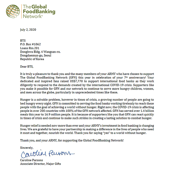 As always, a letter detailing the good work of ARMY has been sent to BTS and Big Hit Entertainment.