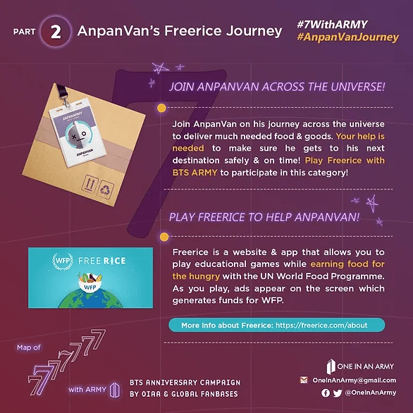 #AnpanVanARMY gave ARMY a new Freerice challenge to assist Van to deliver food packages around the world. Freerice is an ad-supported website/app that lets you play games and earn grains of rice for the United Nations World Food Programme (WFP).