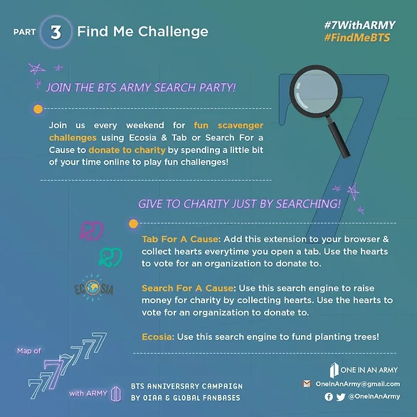 #FindMeBTS challenged ARMY to participate in weekly scavenger hunts using Tab for a Cause, Search for a Cause, and Ecosia. User traffic on all three platforms generates ad-revenue which is then donated to charity (Ecosia donates specifically to reforestation efforts).