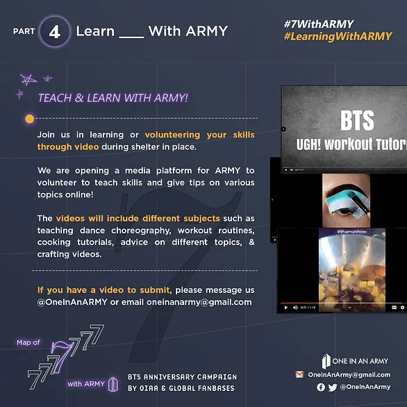 #LearningWithARMY was originally supposed to be a face-to-face worldwide volunteering project, but due to the pandemic we had to adapt to something to meet safety requirements. Seeing the situation of millions of people who had their studies and work interrupted due to physical distancing measures, we decided to launch an online class project which allowed ARMY to share their passions through video tutorials!