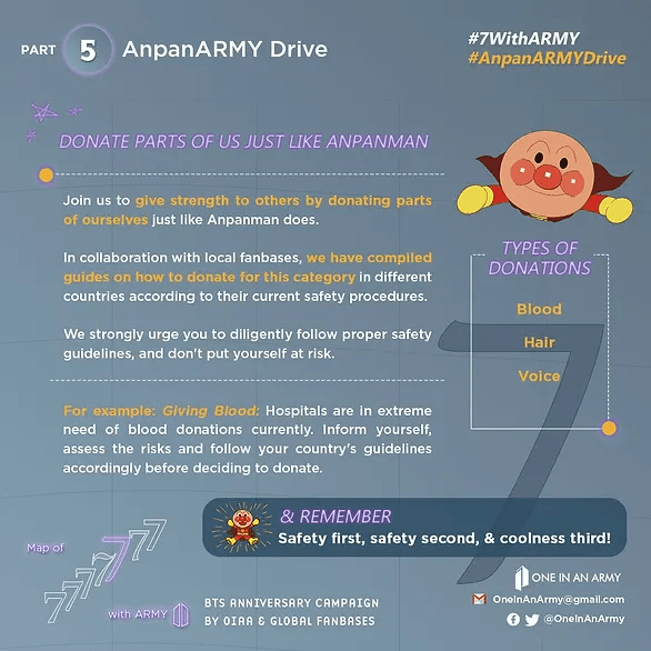 #AnpanARMYDrive encouraged ARMY to follow in the footsteps of Anpanman and donate a part of themselves to those in need. Working with local fanbases, we came up with a list of reputable organizations to give blood, hair, and voice donations.