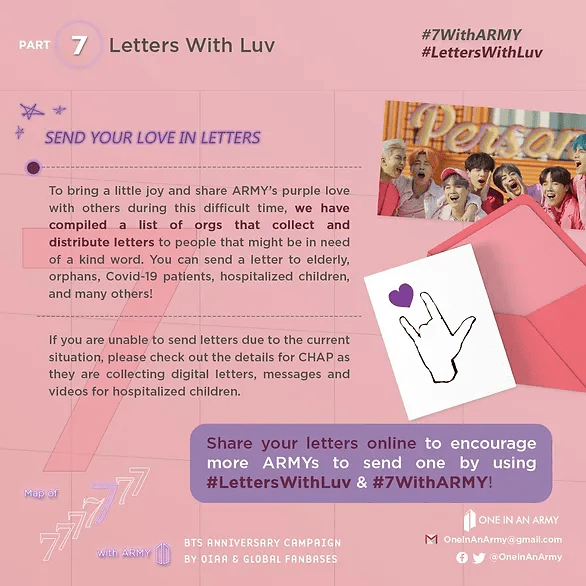 #LettersWithLuv invited ARMY to send physical and digital letters to children in orphanages, seniors, people staying in hospitals, and healthcare workers on the front line of the fight against COVID-19. The letters were intended to brighten the lives of the recipients, who may have been feeling extra isolated or stressed during the pandemic.