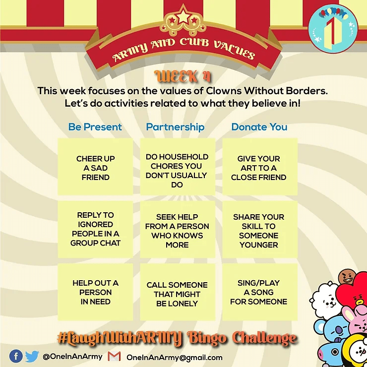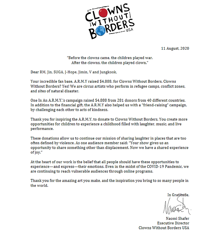 Thank you ARMY for embracing the core values of Clowns Without Borders and spreading joy and laughter all month long!
