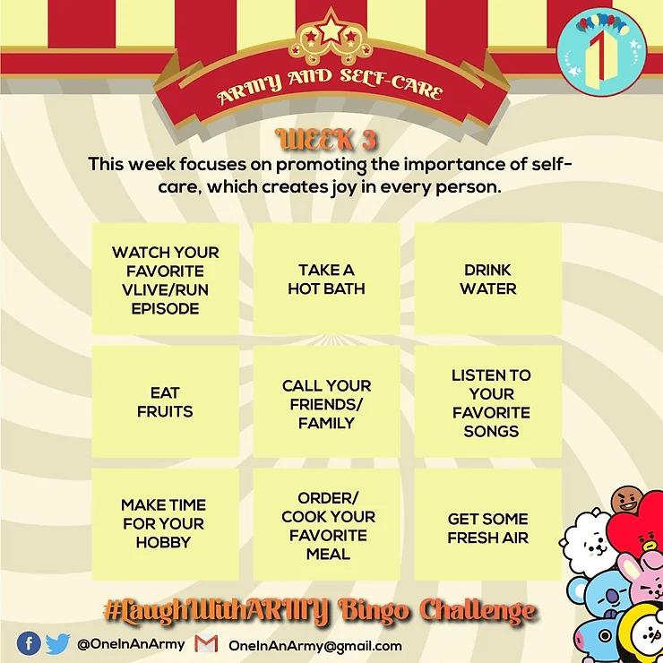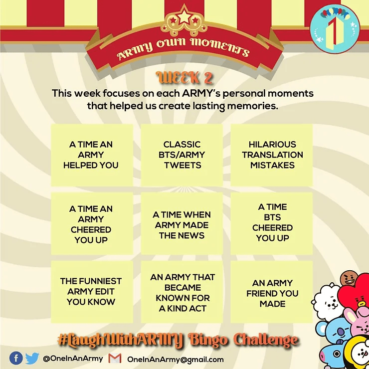 Laughter was the theme of the month, which we carried into our July Bonus Mission: Laugh With ARMY. We released a new bingo card each week that helped ARMY to remember some of our clown moments, moments when we helped each other, moments when we helped ourselves, and encouraged ARMY to bring a smile to someone else’s face. Check out #LaughWithARMY to see more funny moments from the campaign.