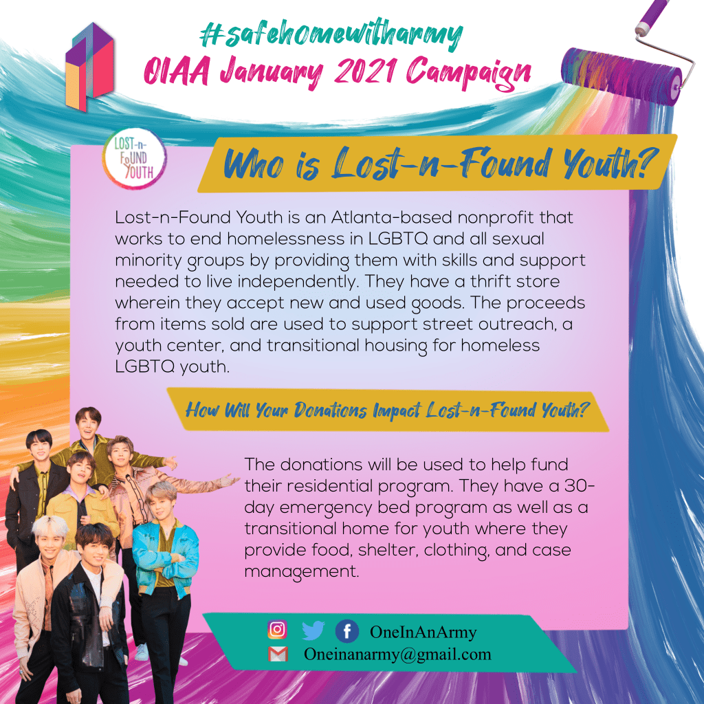 One In An ARMY is extremely proud to announce the results of our January 2021 campaign, Safe Home With ARMY, benefiting Lost-n-Found Youth!
