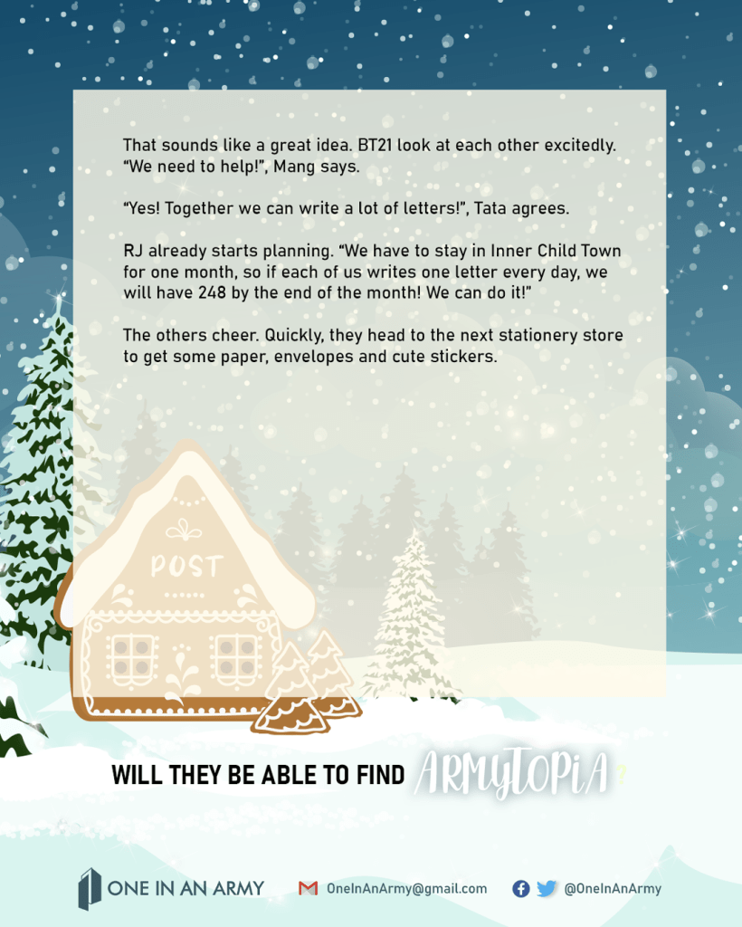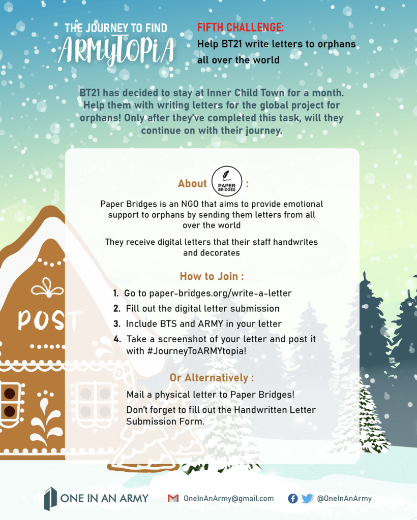 Rallying to help LGBTQ youth experiencing homelessness wasn’t the only thing that kept ARMY busy this month. For the January Challenge of assisting BT21 on their Journey to ARMYtopia, ARMY were asked to help BT21 write letters to orphans all over the world through Paper Bridges.