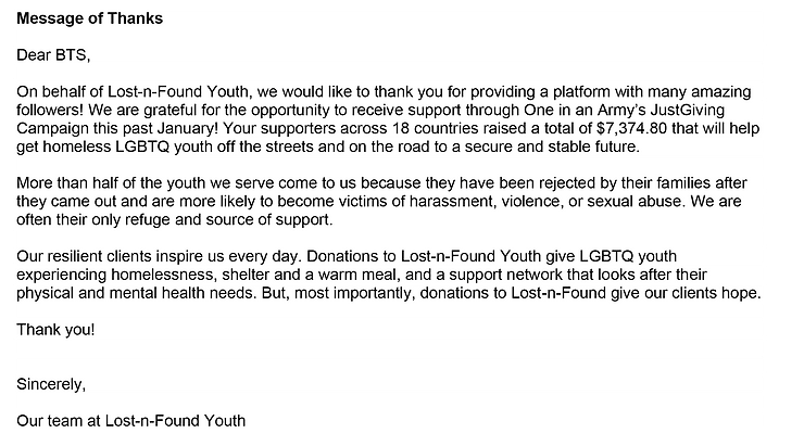 Our friends at Lost-n-Found Youth have sent a letter to BTS and Big Hit to let them know about the good ARMY have done this month.