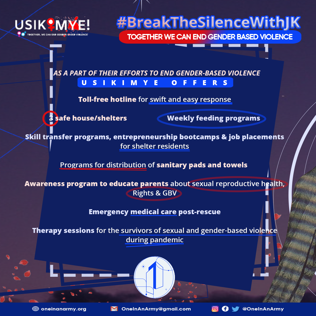 Usikimye is an organization working towards ending the prevalence of sexual and gender-based violence. They exist to ensure that women and girls from Kenya and its environs are safe and free from violence, exploitation, neglect, and abuse and have safe access to high-quality comprehensive responses that are appropriate to their individual needs, vulnerabilities, capacities while at the same time, age and gender-sensitive.
