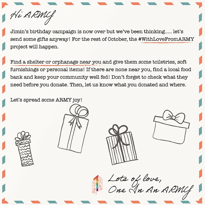 And the bonus mission, With Love From ARMY, encouraged ARMY to contribute to their communities by donating supplies or food to local shelters, orphanages, and food banks!