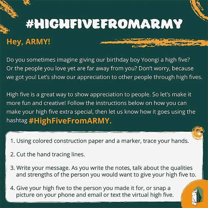 In addition to helping Small Projects Istanbul, ARMY also spread positivity to their friends and family. The bonus mission, High Five From ARMY, encouraged ARMY to trace their hands and write positive messages on them to friends and family.