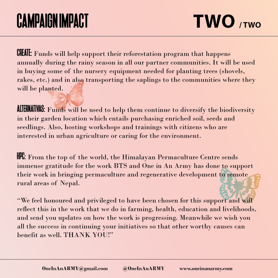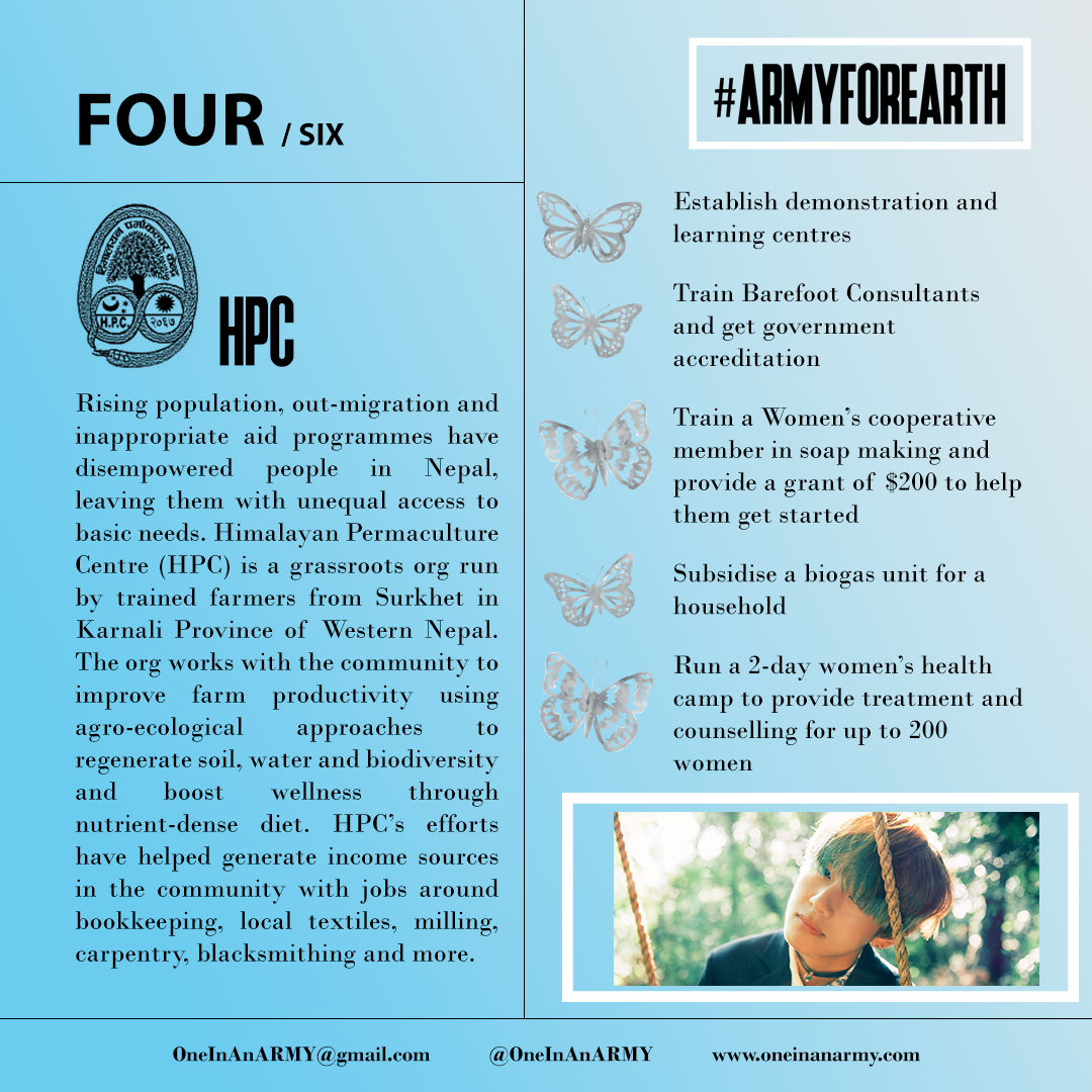 Himalayan Permaculture Centre: From the top of the world, the Himalayan Permaculture Centre sends immense gratitude for the work BTS and One In An Army has done to support their work in bringing permaculture and regenerative development to remote rural areas of Nepal. They feel honoured and privileged to have been chosen for this support and will reflect this in the work that they do in farming, health, education and livelihoods, and will send us updates on how the work is progressing. Meanwhile they wish ARMY all the success in continuing our initiatives so that other worthy causes can benefit as well. THANK YOU!