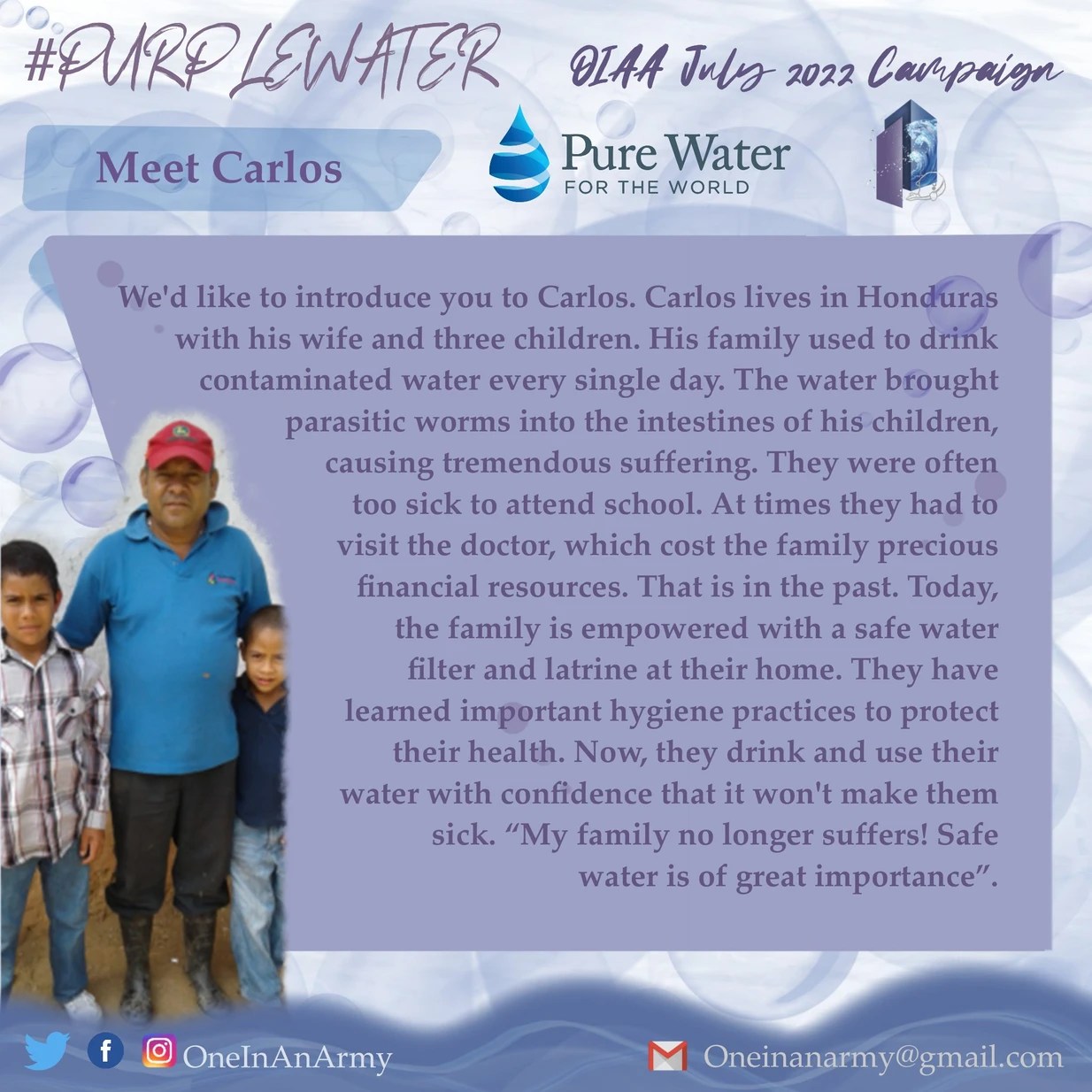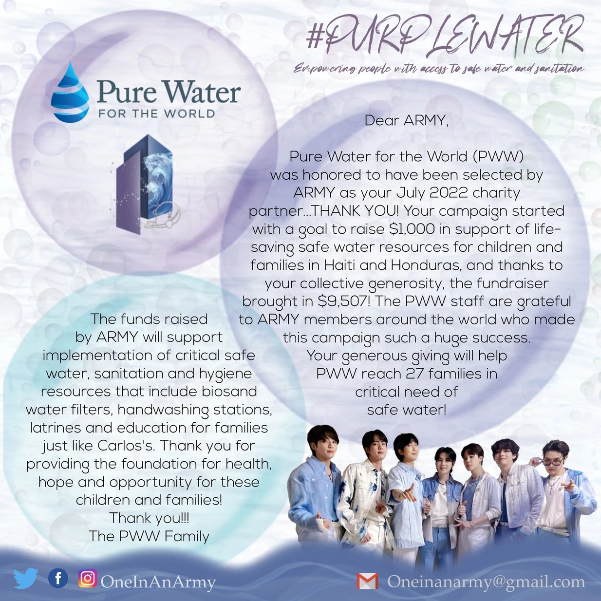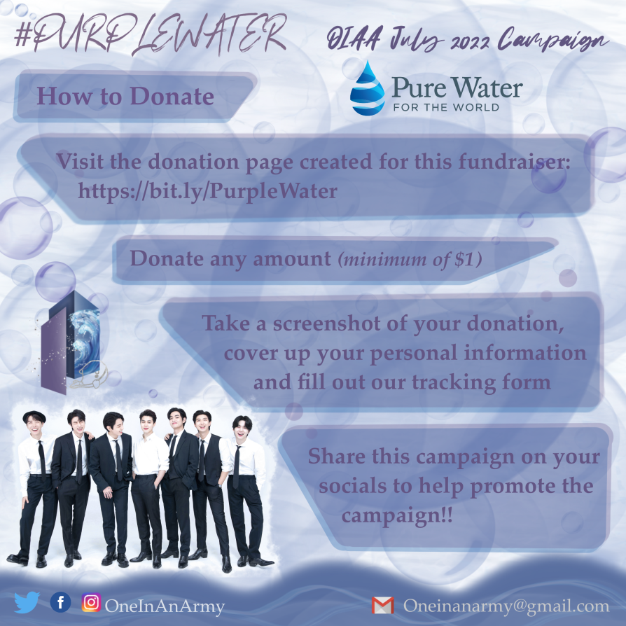 One In An ARMY is extremely proud to announce the results of our July 2022 campaign, Purple Water, benefiting Pure Water for the World honour of ARMYs’ birthday!