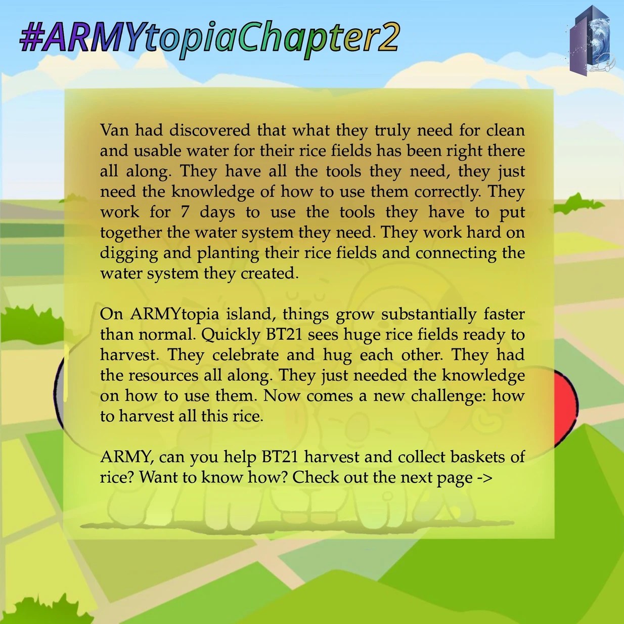 In addition to helping deliver water to those in need, ARMY helped BT21 with Freerice on their ARMYtopia Chapter 2 journey.