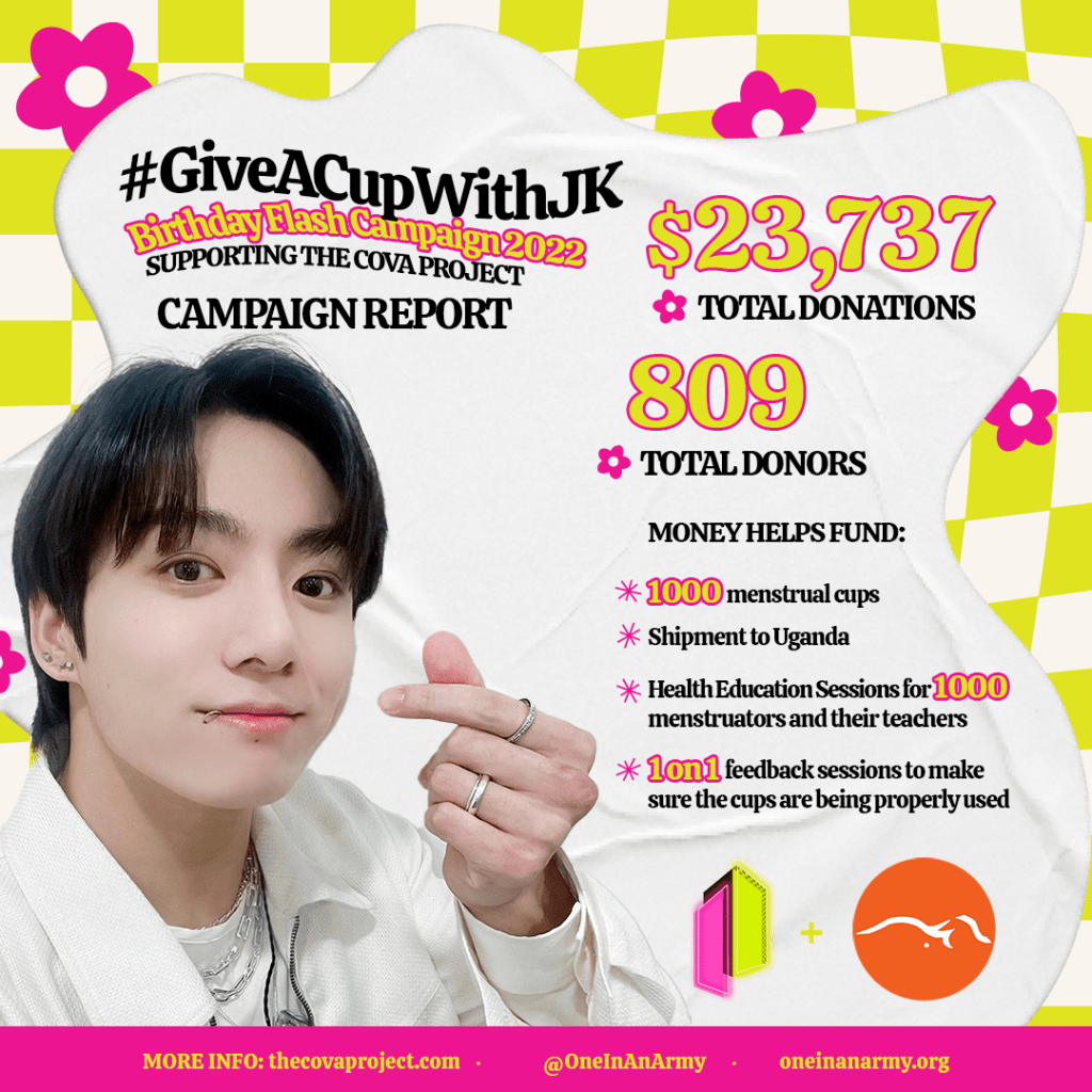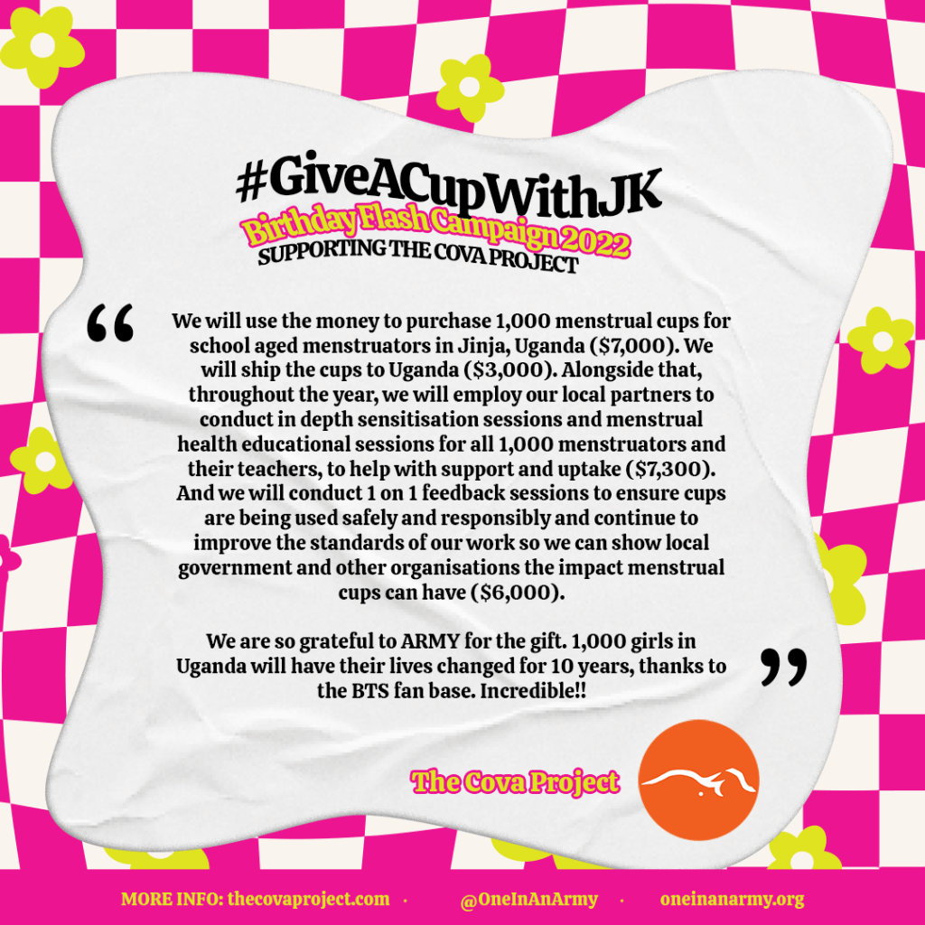 One In An ARMY is extremely proud to announce the results of our first September 2022 flash campaign, Give A Cup With JK, benefiting The Cova Project in honour of Jungkook’s birthday!